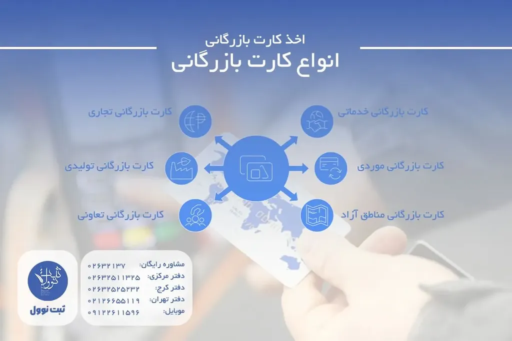 برای اخذ کارت بازرگانی در کرج و انجام امورات و نحوه اخذ آن تنها کافی است با شماره تماسهای مجتمع ثبتی نوول تماس گرفته و با مشاوران این موسسه جهت انجام امور ثبت شرکتها و در ادامه جهت انجام امورات و فعالیتهای اقتصادی و بینالمللی خود در ارتباط باشید.